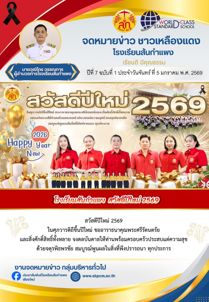 วารสารโรงเรียน สัปดาห์ข่าวชาวเหลืองแดง ปีที่ 7 ฉบับที่ 1 ประจำวันจันทร์ ที่ 5 มกราคม พ.ศ. 2569 5 มกราคม 2026 งานพัฒนาเว็บไซต์ โรงเรียนสันกำแพง 5 Views Post Views: 5