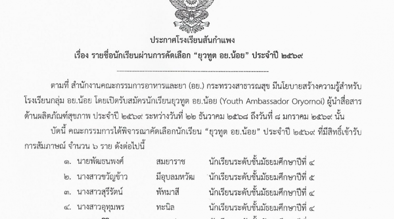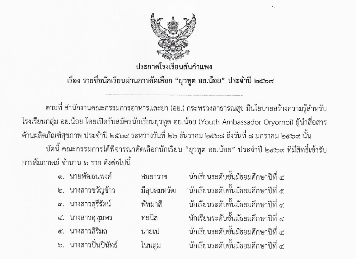 ประชาสัมพันธ์บริหารทั่วไป ประกาศรายชื่อนักเรียนผ่านการคัดเลือก “ยุวทูต อย.น้อย” ประจำปี 2569 9 มกราคม 2026 งานพัฒนาเว็บไซต์ โรงเรียนสันกำแพง 0 Views ประกาศรายชื่อนักเรียนผ่านการคัดเลือก “ยุDownload Post Views: 1