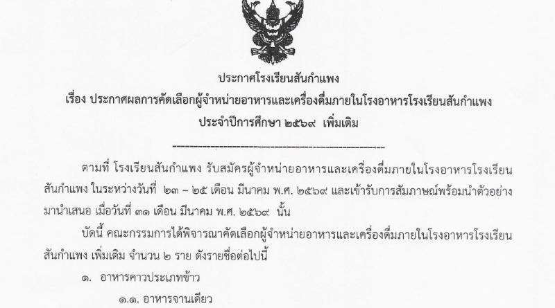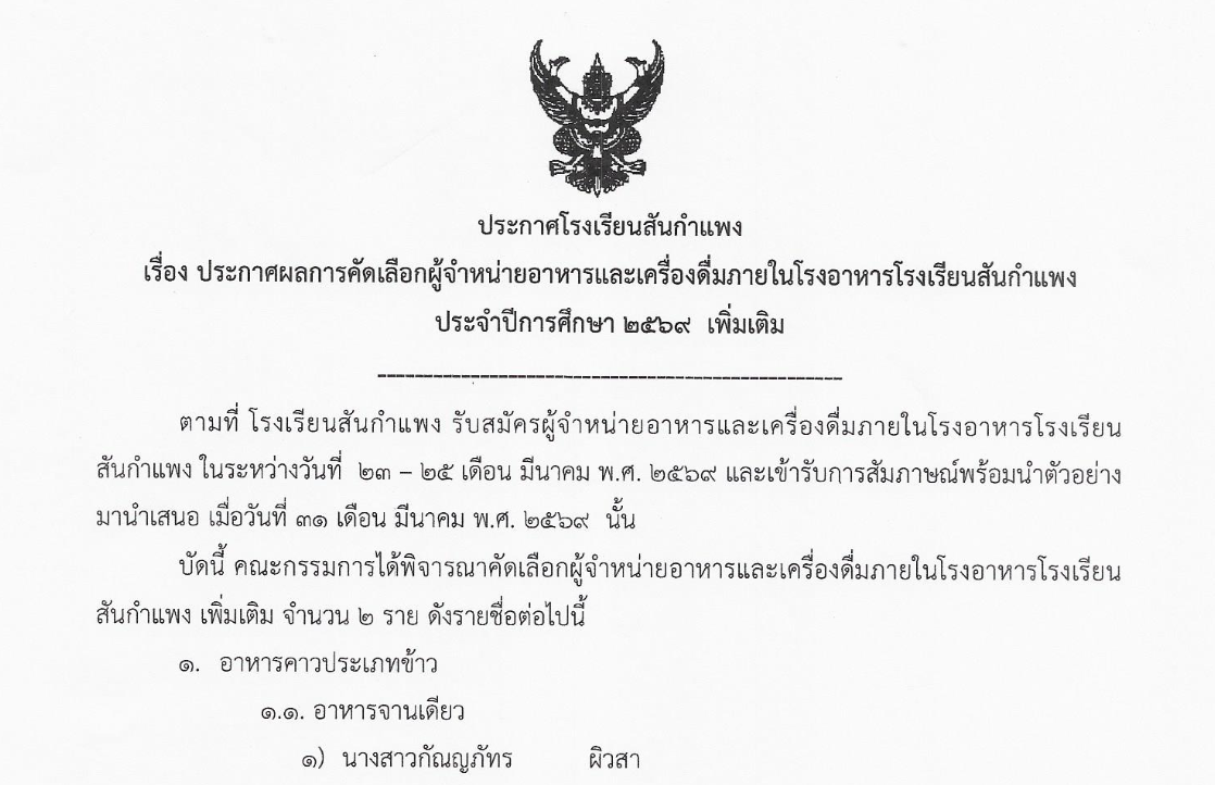 ประชาสัมพันธ์บริหารทั่วไป ประกาศผลการคัดเลือกผู้จำหน่ายอาหารและเครื่องดื่มภายในโรงอาหารโรงเรียนสันกำแพง ประจำปีการศึกษา 2569 เพิ่มเติม 1 เมษายน 2026 งานพัฒนาเว็บไซต์ โรงเรียนสันกำแพง 0 Views ประกาศผลผู้ประกอบการรอบเพิ่มเติมDownload Post Views: 1
