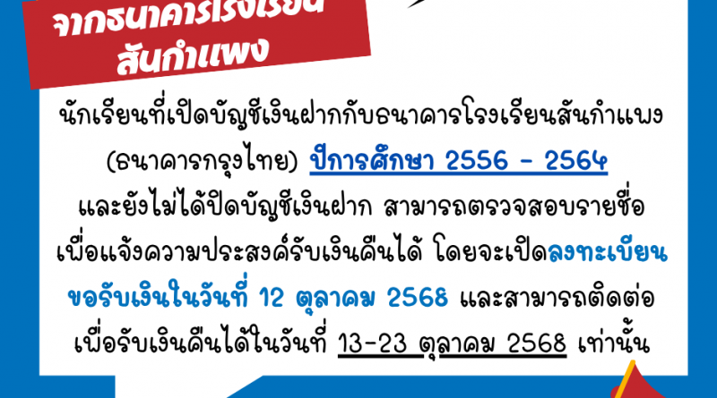 นักเรียนสามารถตรวจสอบยอดเงินและลงทะเบียนขอรับเงินคืนได้ในวันที่ 12 ตุลาคม 2568 (ผ่านลิ้งค์หน้าเฟซบุ๊คแฟนเพจของธนาคารโรงเรียน)